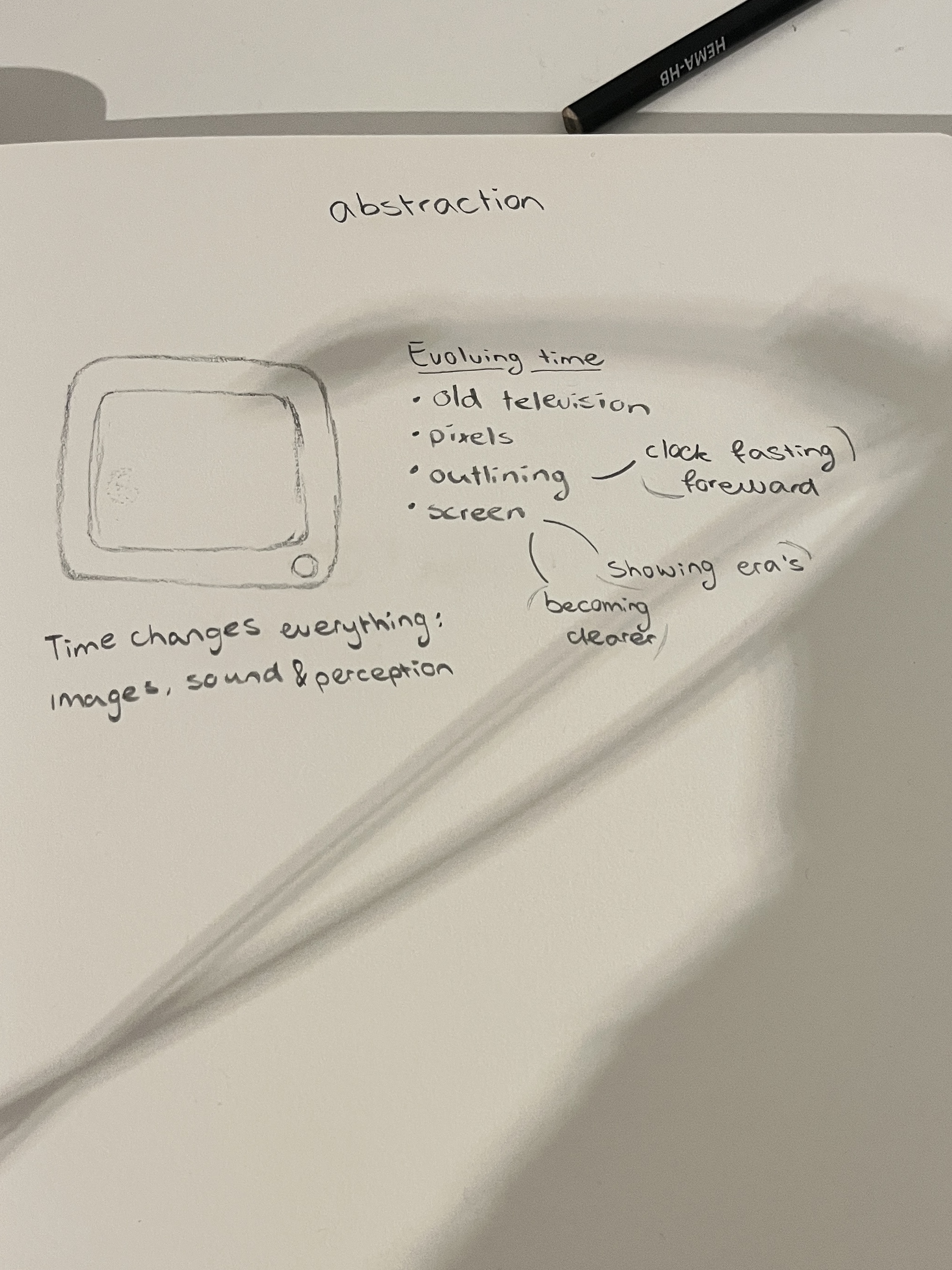 The concept you see here describes the life of an old television combined with the new media. At first, you see that it really is an old television, but as time passes, it becomes newer and newer media, and the television finds it increasingly difficult to keep up with all the breaking news. This is also noticeable in the audio. At the beginning, the audio is still soothing music, but as newer media appears on the screen, everything gets mixed up and distortion begins to occur, until eventually only a monotonous beep remains.